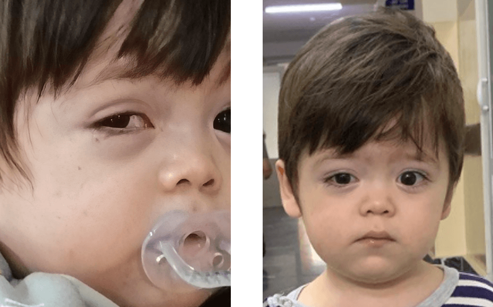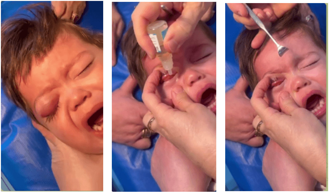 On February 4, the condition of the right eye began to deteriorate, with swelling of the upper and lower eyelids, conjunctival redness, and severe eye pain. The child was referred to City Clinical Children's Hospital No. 1, where the patient's mother was told there was no indication for hospitalization and was advised to continue the same drops at home.