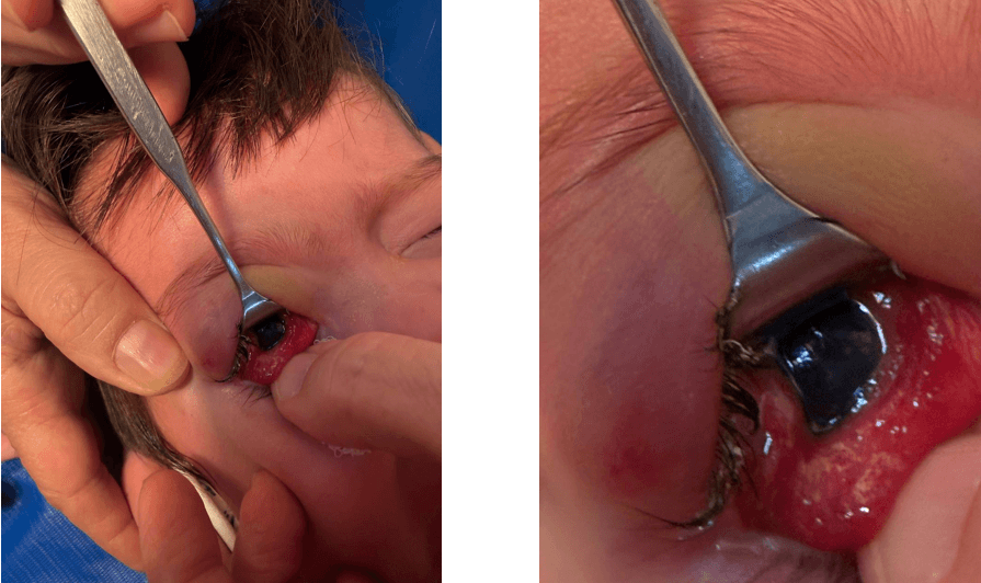 On February 5, the child's parents returned to the Republican Clinical Hospital for Children and Youth, where, after an examination, they decided to remove the fibrin film from the conjunctiva, after which a 1% dexamethasone solution was inappropriately injected into the temple. The condition in the right eye progressed, with clinical signs of keratoconjunctivitis appearing, as well as conjunctivitis developing in the left fellow eye, which prompted and justified the patient's urgent hospitalization in the pediatric ophthalmology department of City Children's Hospital No. 1.